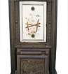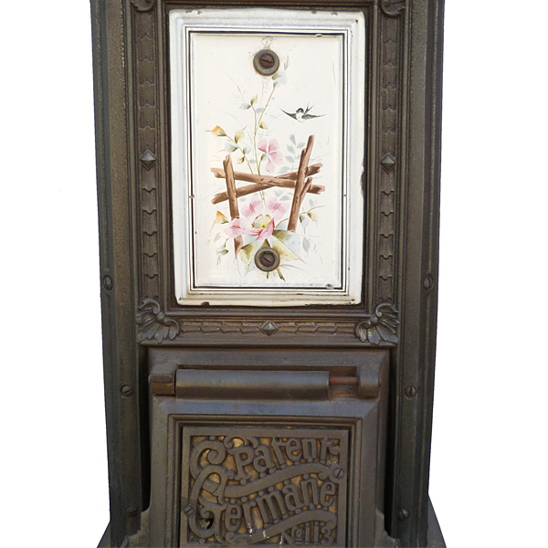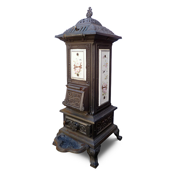 Quadratisch-hochrechteckiger Dauerbrandofen nach irischem System mit Aschenfänger und Zierhaube. Front und beide Seiten mit buntemaillierten Zierblechschildern in zartem Jugendstildekor. Der in 3 Größen gefertigte, im Brennraum mit Phönixsteinen (Rillensteinen) ausgemauerte Ofen konnte wahlweise "sauber geschwärzt, theilweise vernickelt und geschwärzt" sowie farbig emailliert - dunkelgrün oder braun mit Gold - bestellt werden.