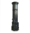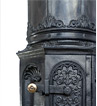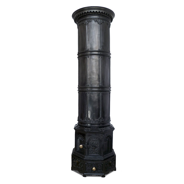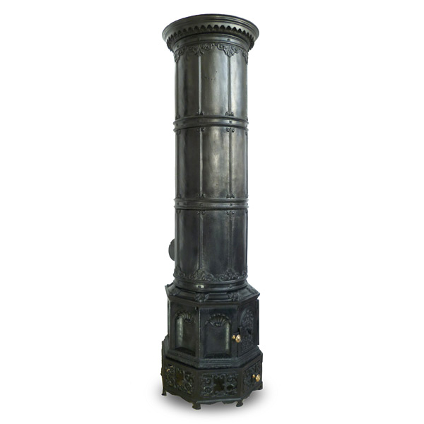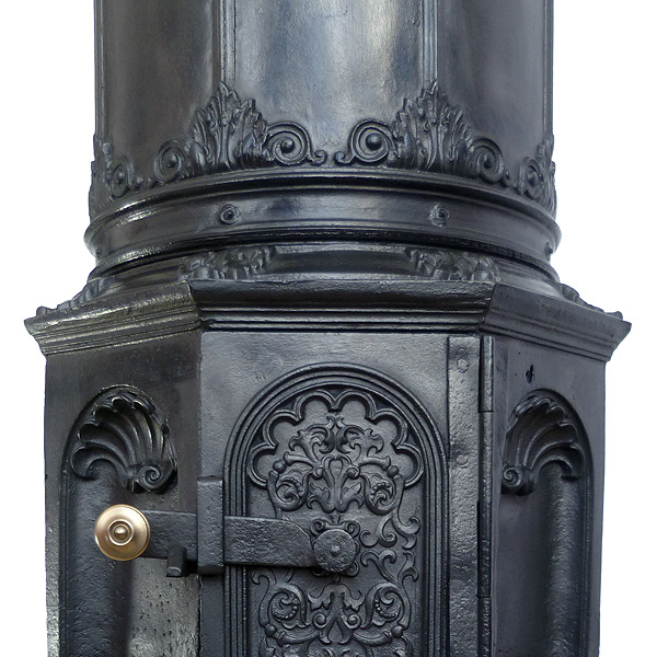 Aus sechs Hauptteilen bestehender klassischer Biedermeierofen für langflammige Brennstoffe. Oktaedrische, am Stück gegossene Brennkammer mit muschelförmigen Ausbuchtungen auf durchbrochenem Aschenkastensockel sowie Tropfenkappe als Abschluss.