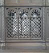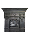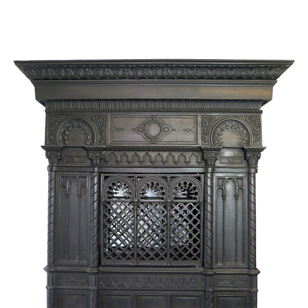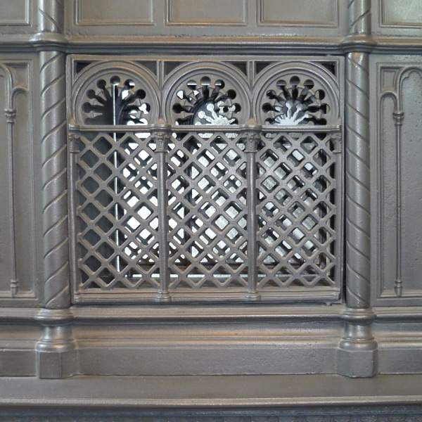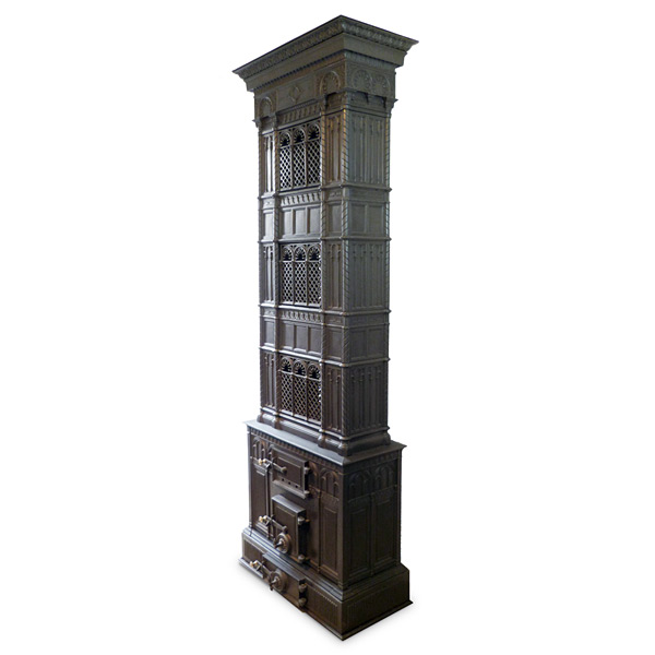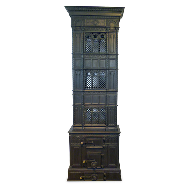 Auffälliger, langrechteckiger, in polygonal-geschwungener Grundform entworfener „Windofen“ für langflammige Brennstoffe mit am Stück gegossenem Aschenkastensockel und sechsteiliger Brennkammer. Dreietagiger, S-förmig zugverlängernder Überbau mit Senkrecht- und Waagerechtschächten in klassisch-barockem Doppelschwung. Flächenbedeckendes Efeurankenwerk mit Rauteneinlagen sowie ebenso efeugefasste, durchbrochene Rundbogenziertüren mit zentraler, sternförmiger Kreisornamentik unterstreichen das durch die Architektur schon harmonische Erscheinungsbild. Der Efeu gilt u.a. als Symbol ewiger Liebe und Treue. Feuerungstüre mit querluftgeführter Vortüre.