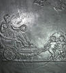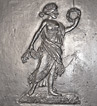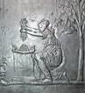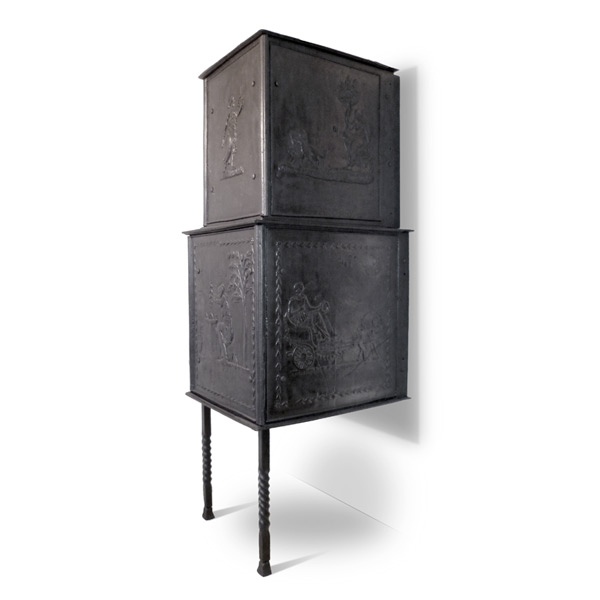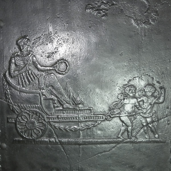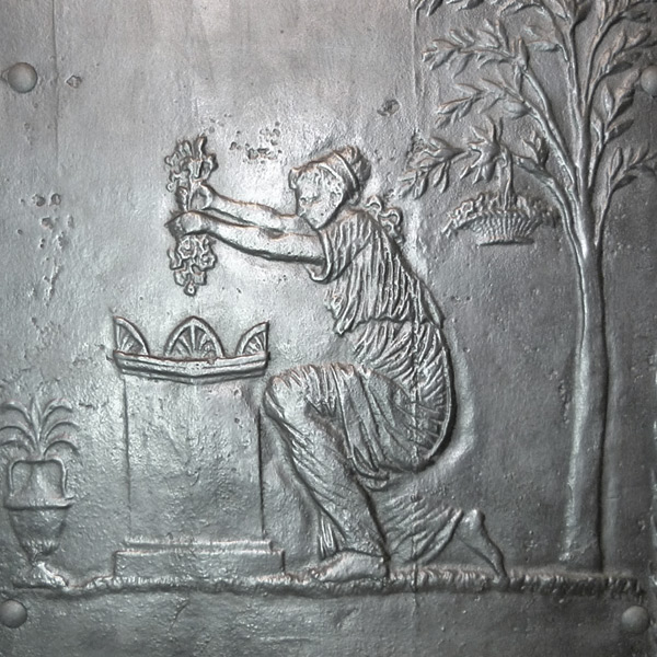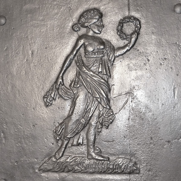 Klassizistischer Fünfplattenofen mit ebenfalls fünfteiligem zugverlängernden, gusseisernen Aufsatz. Alle Platten mit umlaufendem Profilrahmen; Stirnplatten mit integrierten, halbrund ausgeformten Eckleisten. Allegorische Darstellung der Liebe und der Fruchtbarkeit in Gestalt der Erdmutter Kybele in antikisierendem Gewand, mit entblößter Brust. Ferner Opferszene mit antikisierend gekleideter Flora, die eine Fruchtgirlande niederlegt.