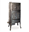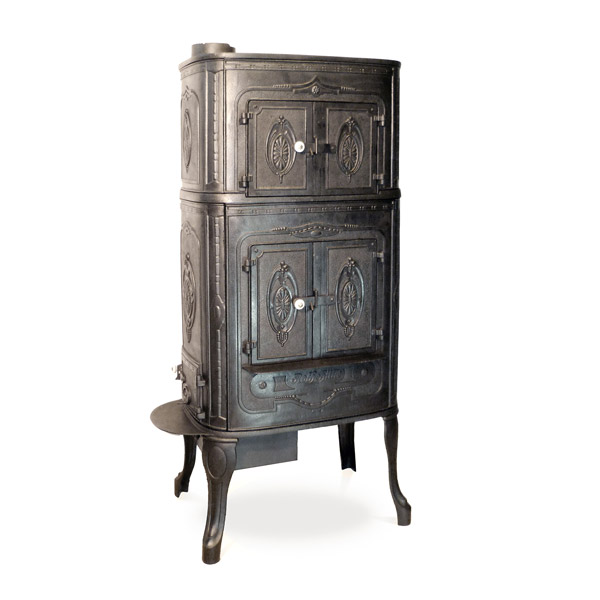 Hohe Kochkammer über flachem Brennraum mit kochringbesetztem Einlageboden, S-förmigem Zugverlauf und integriertem Dunstabzug. Warmhaltekammer zwischen Übergangsrahmen und flachem Abschlussdeckel mit Rohrstutzen und Revisionsöffnung. Vollflächige Doppelflügeltüren beider Kammern mit porzellanknopfversehenen Querriegelverschlüssen. Ovale Türfüllungen im Flachrelief in stilisierter Blatt- und Blütenornamentik auf gerauhtem, stabrandgefasstem Hintergrund.