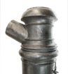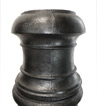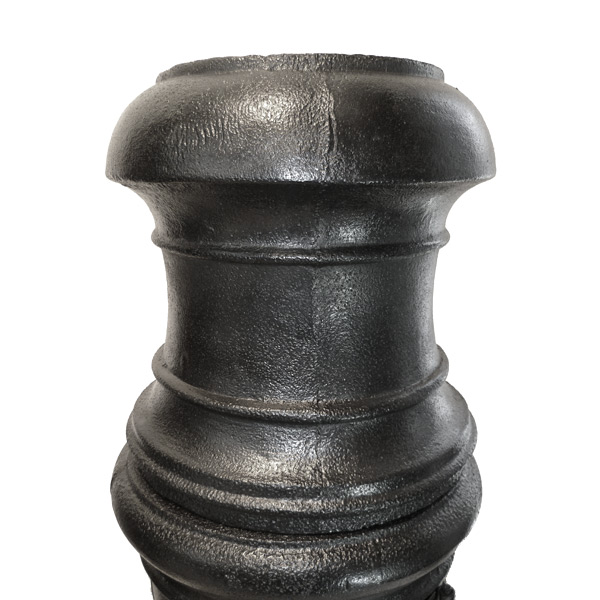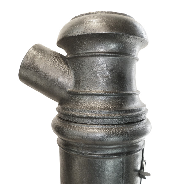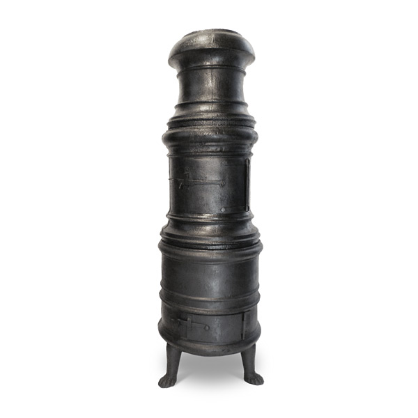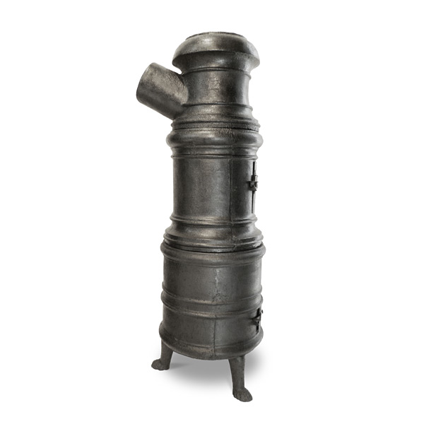 Dreiteiliger, raumseitig zu befeuernder, schwerer Ringwulstofen mit Schür- und Aschentüre, reversiblem Rundrost und kappenartigem Drehrohrstück.