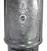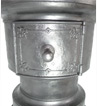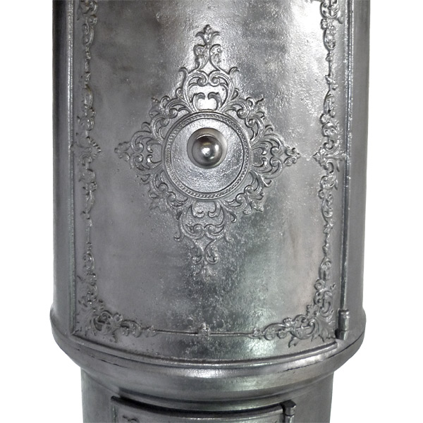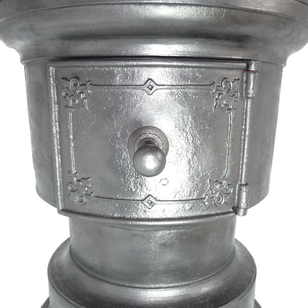 Schlichter, doch in der Formgebung außergewöhnlicher Kohleofen mit großer - als Besonderheit einteilig gefertigter - "Kochkachel". Der Ofen besteht aus vier zylindrischen, im sogenannten "steigenden Gussverfahren" am Stück hergestellten Hauptteilen.