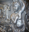 Äußerlich mit dem Original um 1880 völlig identisches, technisch jedoch mit Doppelzug ausgestattetes Replikat anno 1986, aus 52 Einzelteilen gefertigt. Aschenkastensockel und Zugverlängerer jeweils am Stück gegossen. Der durchgehend im neobarocken Stil gehaltene Ofen in mehrfach geschwungener Linienführung besticht durch aufwändige Details: Das üppige, überaus plastische Rundum-Dekor mit Motiven aus der Pflanzen-, Tier- und Fabelwelt, musizierende Putti, die krönende Hohlkugel und die speziell gefertigten, originalgetreuen Porzellanknöpfe in Messingfassung.