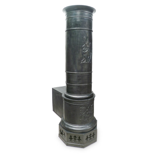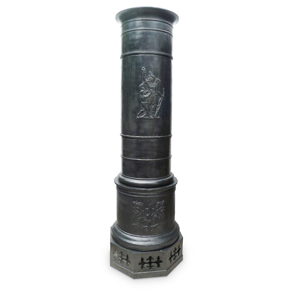 Schlicht gehaltener, ganz dem Biedermeier entsprechender, vermutlich in mehreren Größen als Hinterlader gefertigter fünfteiliger Historienofen mit Steig- und Sturzzug für langflammige Brennstoffe. Wuchtiger, runder Brennraum mit rechteckig angeformtem "Langhals" und ringwulst- bzw. stabrandgefassten zylindrischen Zugverlängerern zwischen achteckigem, durchbrochenen Fußsockel und kappenartigem Revisionshut.