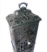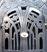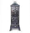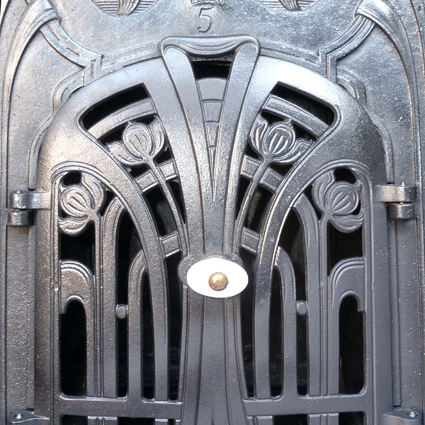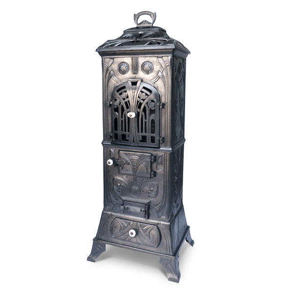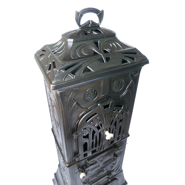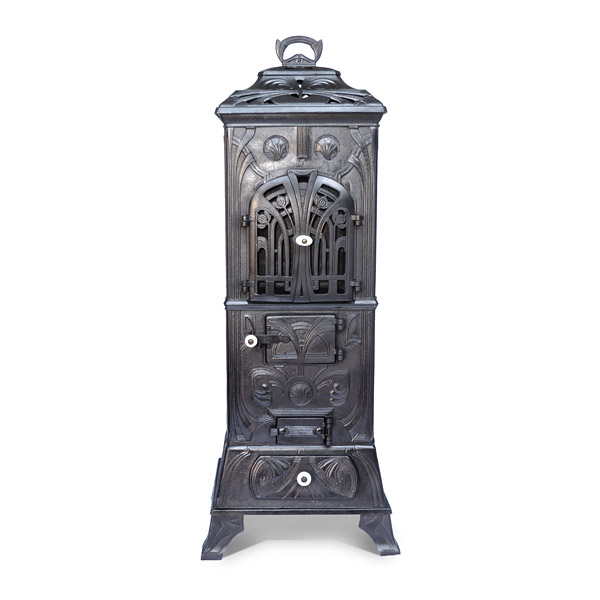 Einteilig gefertigter Jugendstilofen mit separater Zierhaube in durchbrochener Ausführung. Leicht ausladender Aschenkastensockel samt zierblendenversehenem Aschenkasten auf schwerer, vierbeiniger Grundplatte. Brennraum mit Kohlebecken und ovalem Tafelrost.