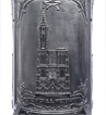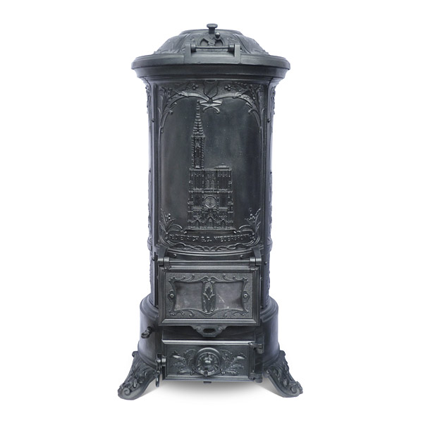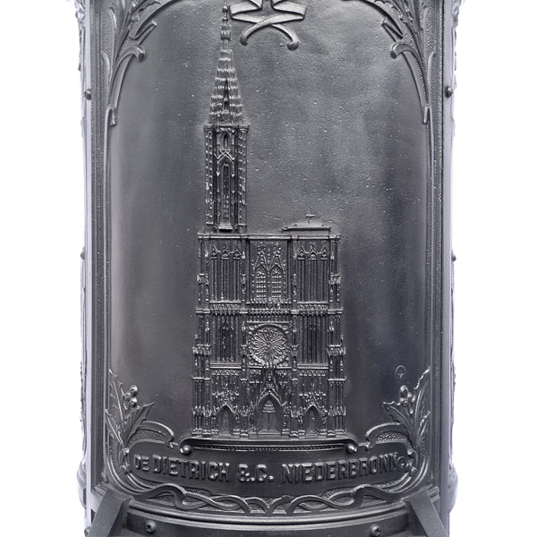 Die künstlerische Ausgestaltung dieses Ofens ist sicherlich als Hommage an die urspünglich aus Straßburg stammende Industriellenfamilie de Dietrich zu sehen: Frontseitig in Jugendstilornamentik gefasste, freigestellte Ansicht des Straßburger Münsters als fein profiliertes Flachrelief nach einer zeitgenössischen Druckvorlage.