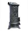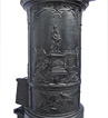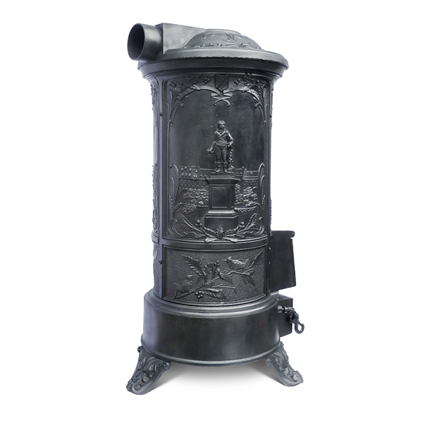 Geschichtsträchtiger runder Dauerbrandofen mit auffälligem Lokalkolorit. Dreiteilig gegossener Ziermantel zwischen einteiligem Aschenkastensockel auf