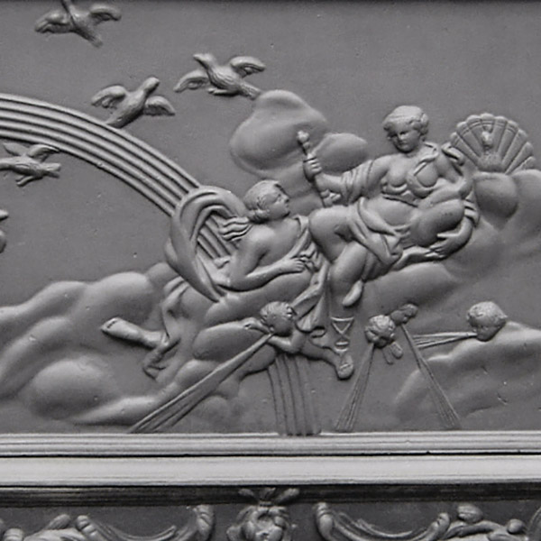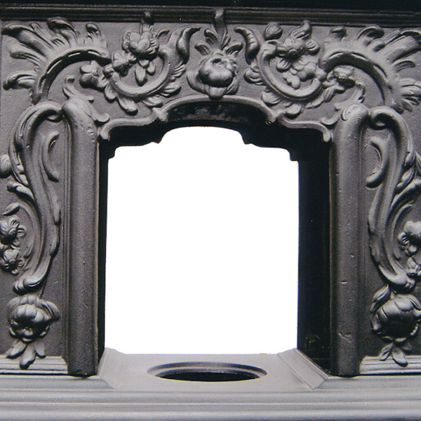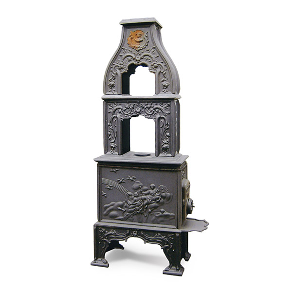 Klassischer Holzofen mit auffälliger Parallelarchitektur zu zeitgleichen Zirkulieröfen Harzer Provenienz. Rechteckiger, seitlich zu bedienender Etagenofen im (Neo)-Rokokostil. Auf ausladendem Fußgestell zum Tragen kommender sechsteiliger Brennraum mit mythologischer Motivgebung auf den Längsseiten. Zurückspringende, übereinandergesetzte, als Durchreiche ausgeführte Stockwerke mit flächendeckender Rokoko-Ornamentik. Der in seiner ursprünglichsten Form durch den dänischen Bildhauer Henrich Bech (1718-1776) entworfene, hier gezeigte Etagenofen der 1657 gegründeten, in der Grafschaft Telemark gelegenen Eisenhütte dürfte zu den weltweit am häufigsten gegossenen Holzöfen zählen. Der griechischen Mythologie folgend ist das Hauptmotiv: Iris übergibt Juno den Heroldstab.